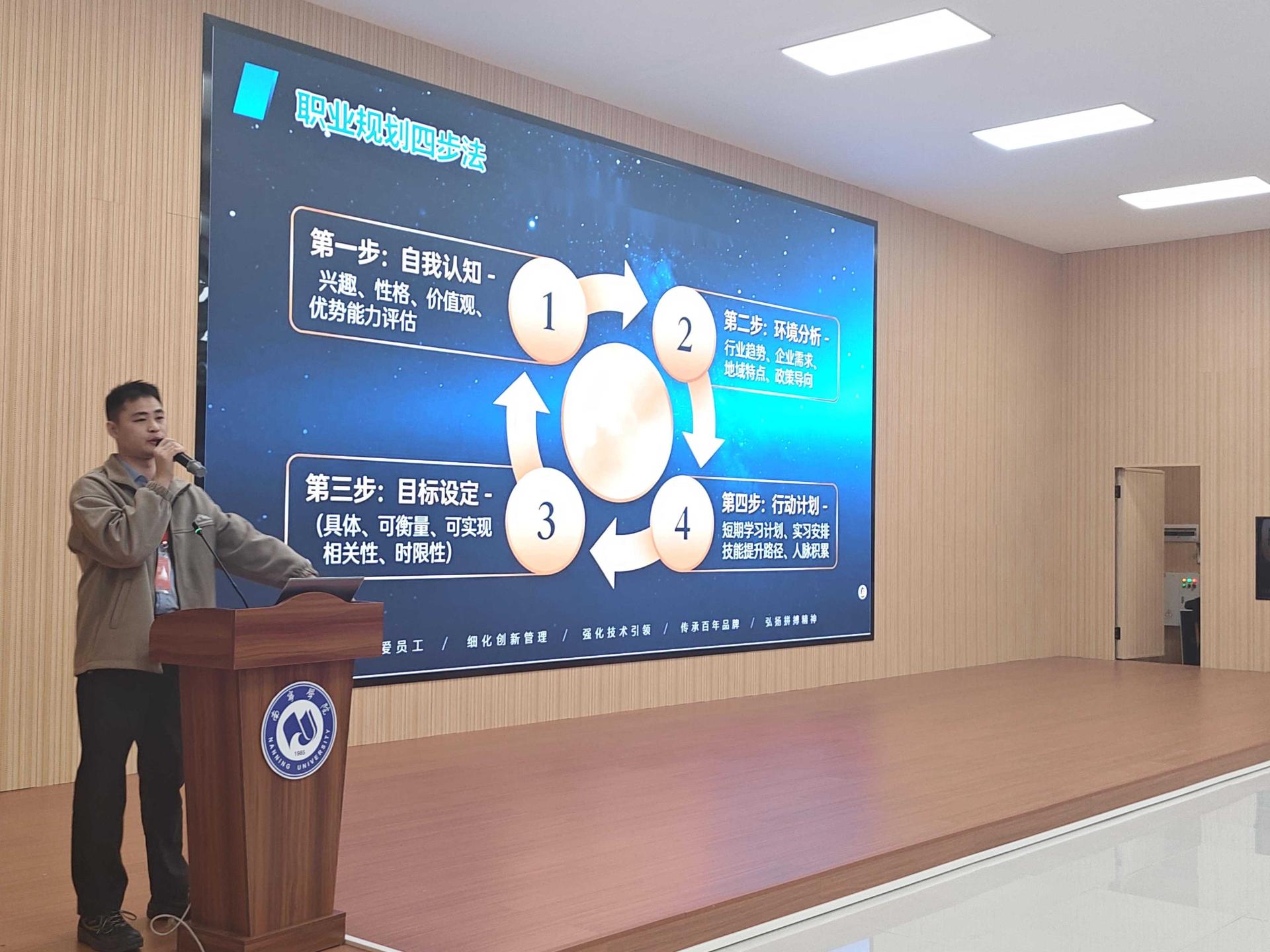 论坛由智能制造学院副院长黄世玲主持。首位分享嘉宾是玖龙纸业人力资源部汤春青经理,结合企业选才与育人双重视角,向同学们分享了实用的“职业规划四步法”,为个人职业路径的规划提供了清晰指引。该方法循序渐进,依次为:自我认知,即梳理个人兴趣、性格、价值观与优势能力;环境分析,把握行业趋势、企业需求、地域特点与政策导向;目标设定,确立具体、可衡量、可实现、具相关性且有时限的目标;行动计划,制定涵盖短期学习、实习安排、技能提升与人脉积累的执行步骤。王路军指出,专业技能是求职的基础,而主动规划的意识、持续学习的能力以及全面的职业素养,已成为企业在选拔人才时越来越重视的关键素质。